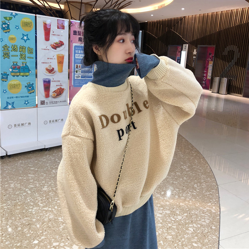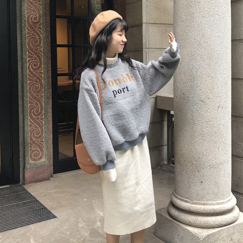 / 網紅兩件套冬裝新款女拼接羊羔毛衛衣外套高腰顯瘦半身裙子套裝