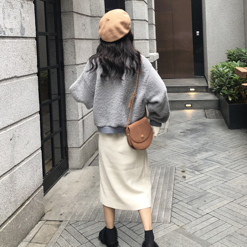 網紅兩件套冬裝新款女拼接羊羔毛衛衣外套高腰顯瘦半身裙子套裝