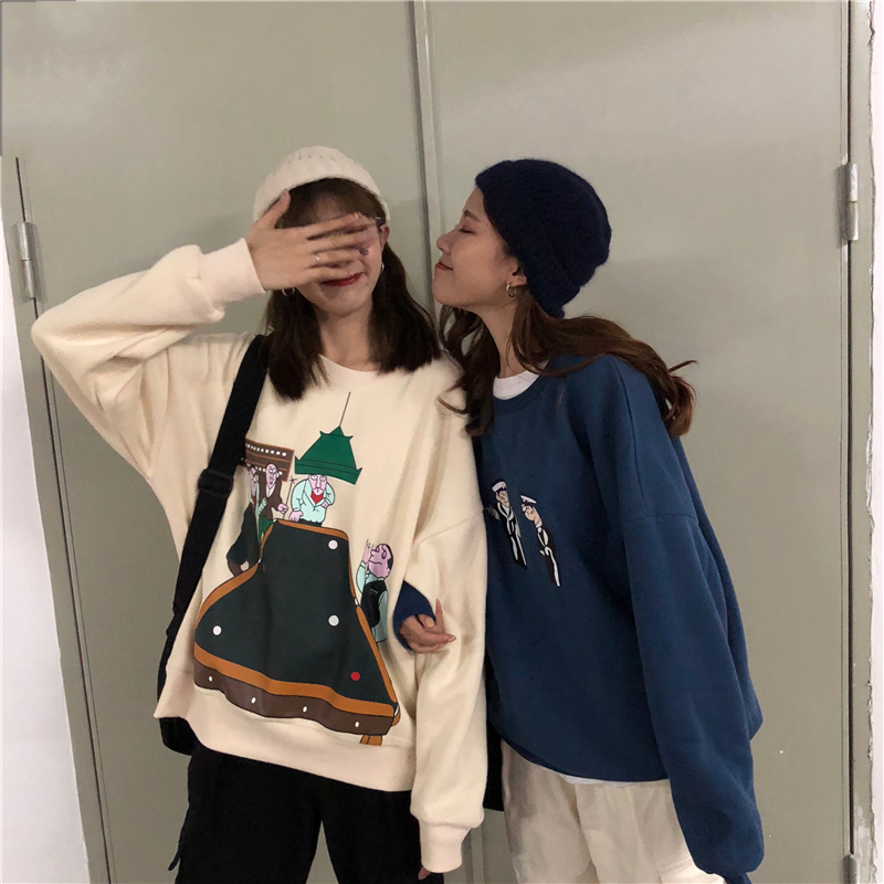 2018新款秋冬女裝韓版復古寬松卡通加絨加厚保暖套頭衛衣上衣外套