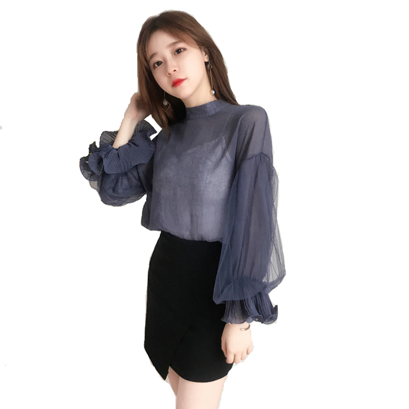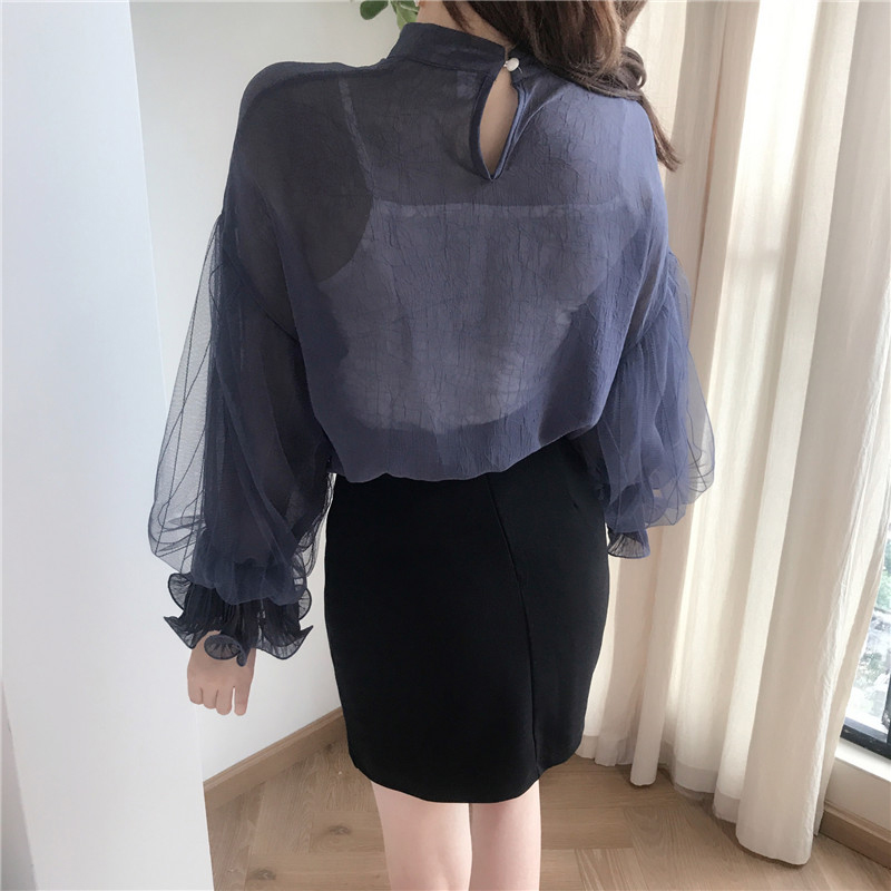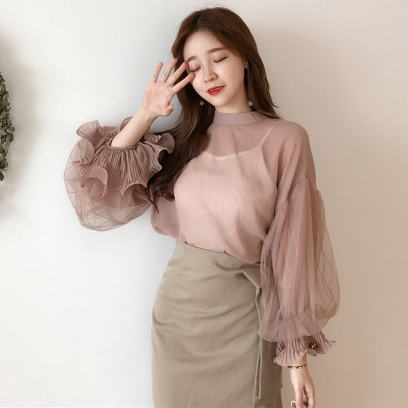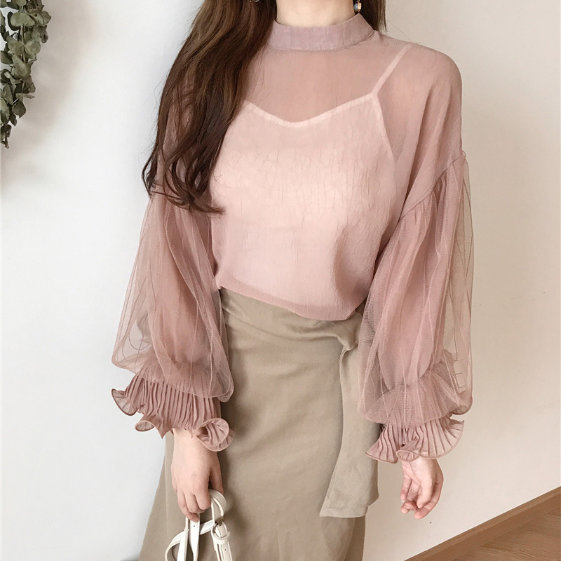洋氣兩件套秋裝女2018新款寬松立領燈籠袖雪紡上衣+打底吊帶背心