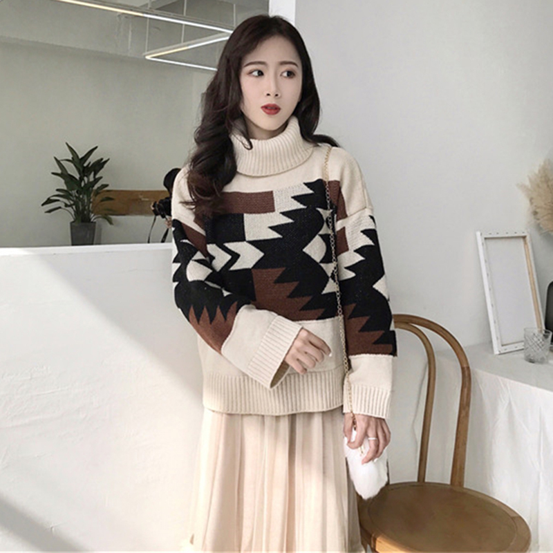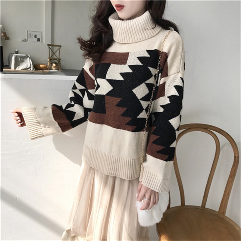 慵懶風高領毛衣外套女冬裝2018新款韓版寬松幾何圖撞色長袖針織衫