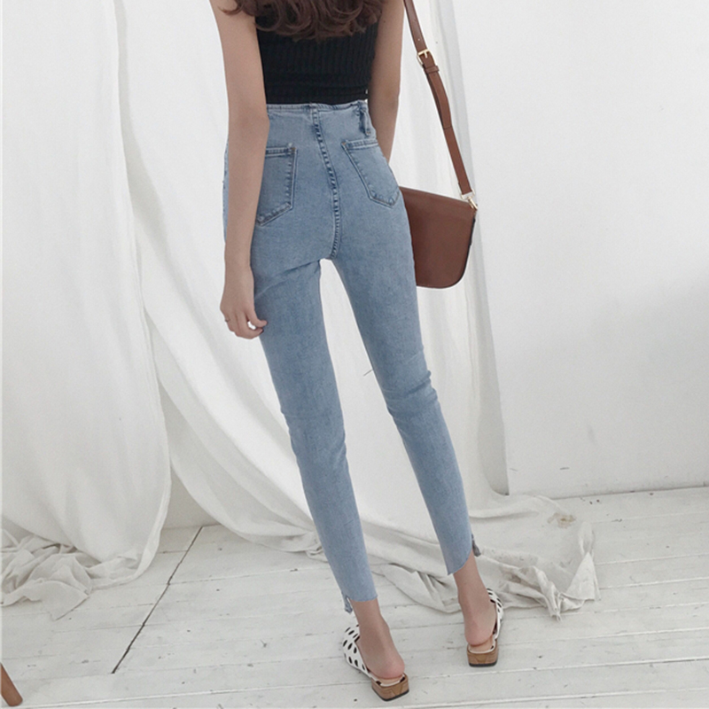 九分褲女夏新款韓版女裝拉鏈高腰修身鉛筆褲不規則褲腳破洞牛仔褲