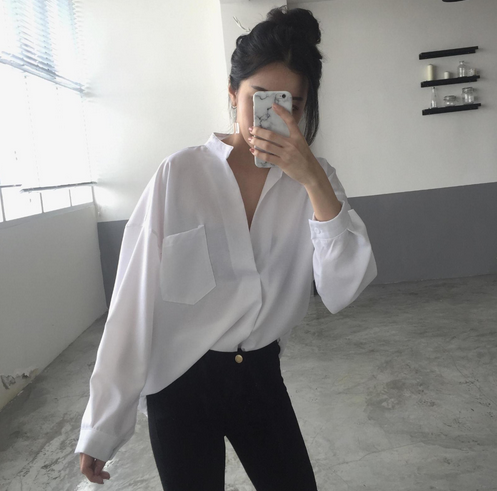 / 秋裝新款氣質大V領白襯衫女長袖韓范寬松韓版襯衣學生上衣夏韓國