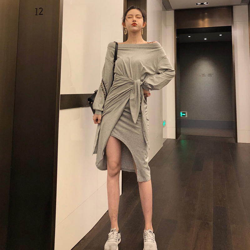 / 秋裝女新款修身氣質成熟長袖連衣裙顯瘦一字領不規則系帶中長裙子