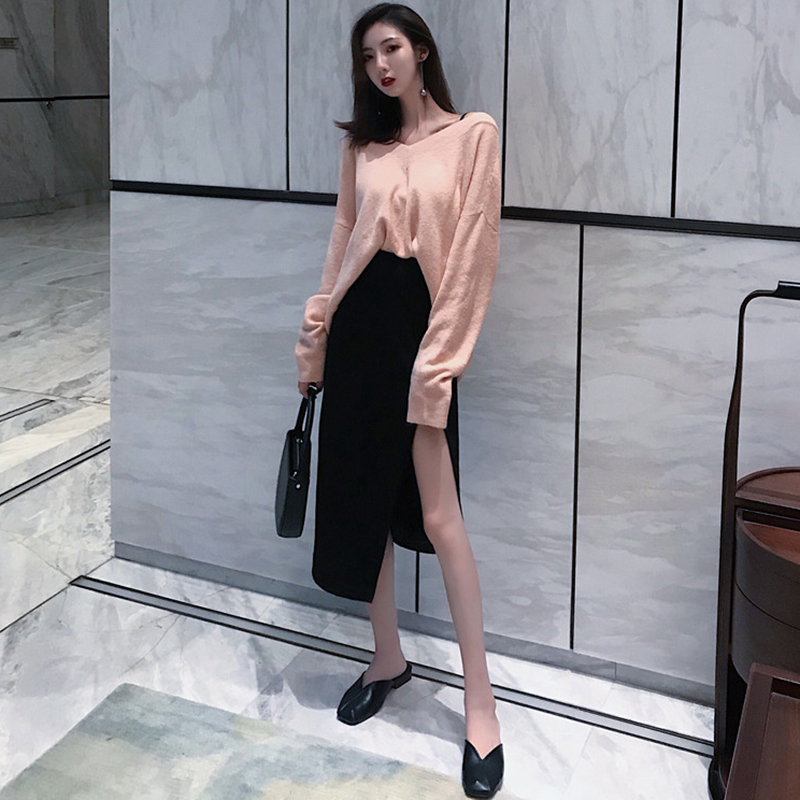 女秋裝2018新款慵懶寬松長袖V領毛衣純色上衣高腰開叉半身裙套裝