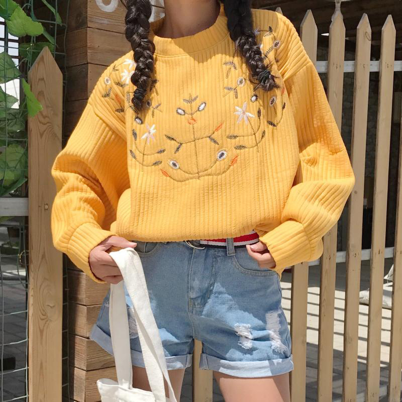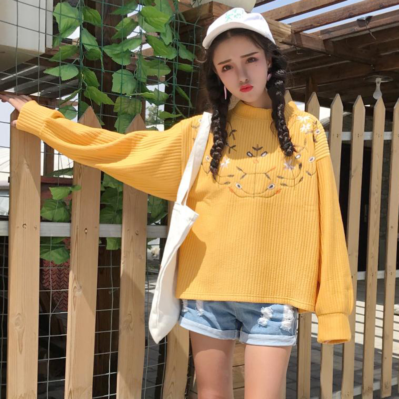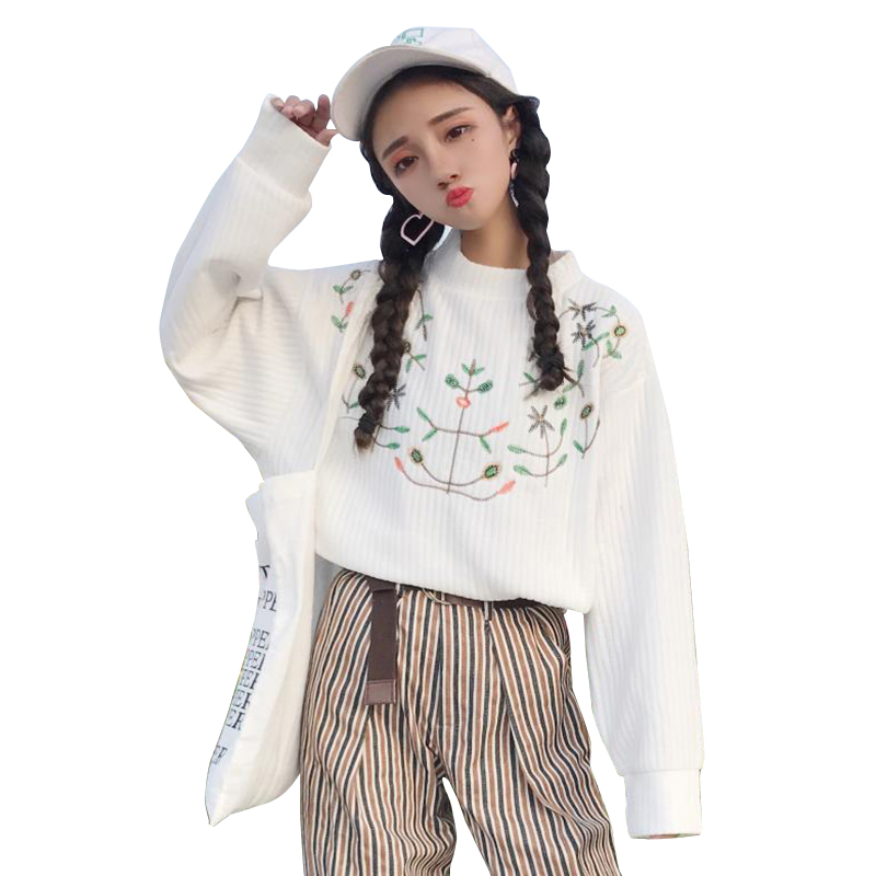 學生百搭套頭衛衣女2018秋裝新款韓版繡花寬松蝙蝠衫休閑長袖上衣