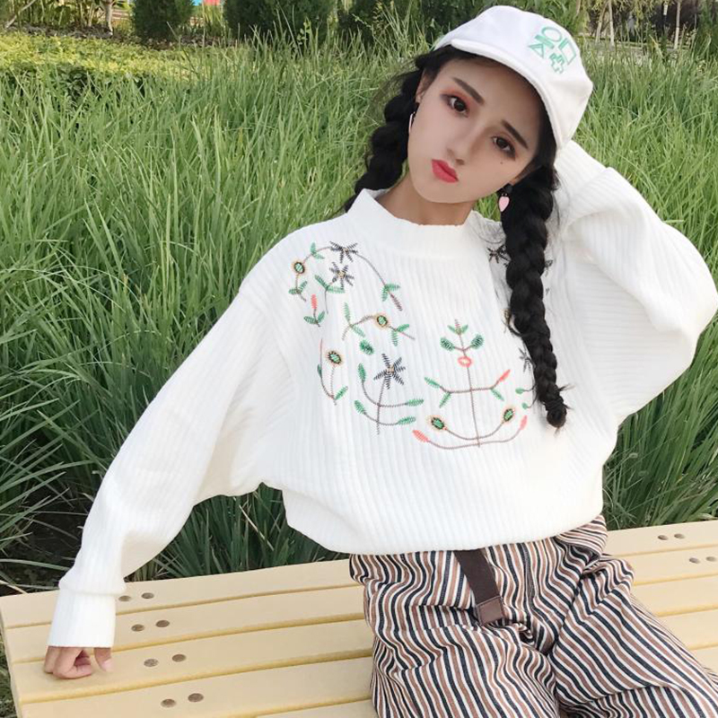/ 學生百搭套頭衛衣女2018秋裝新款韓版繡花寬松蝙蝠衫休閑長袖上衣