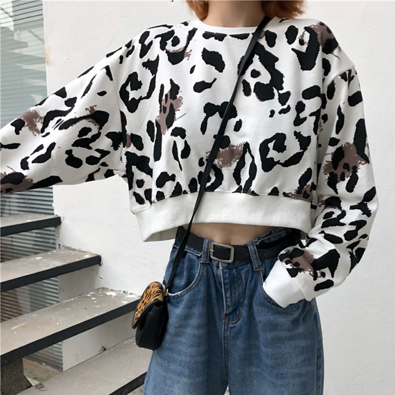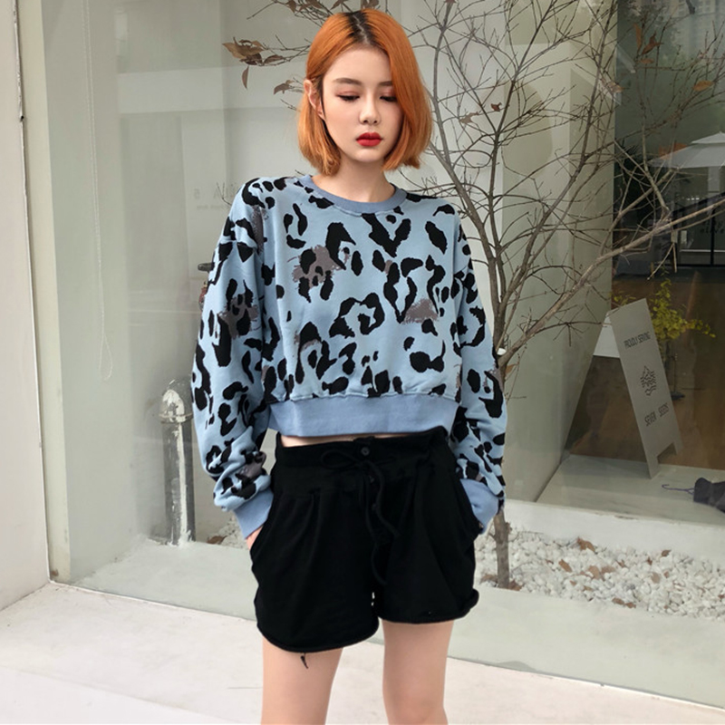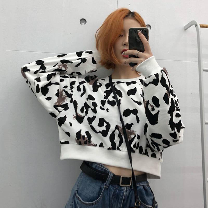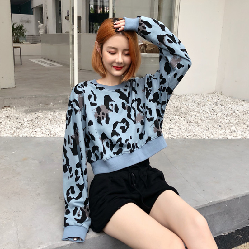 / 復古豹紋圓領短款套頭衛衣秋裝女2018新款學生寬松長袖外套上衣潮