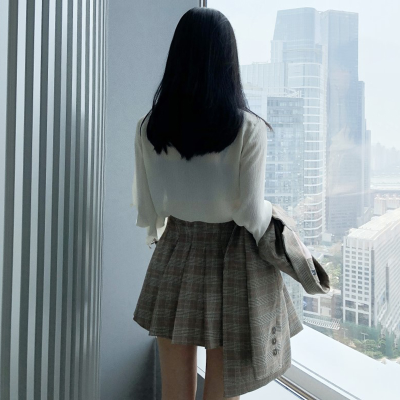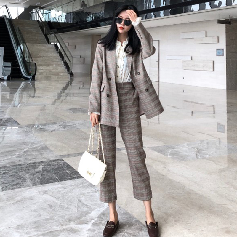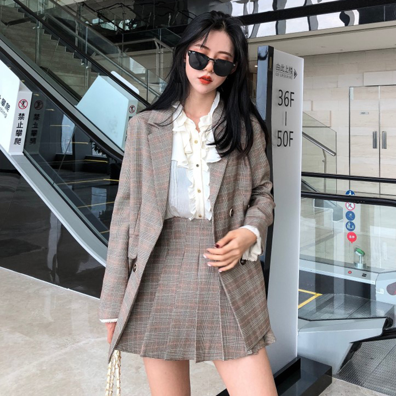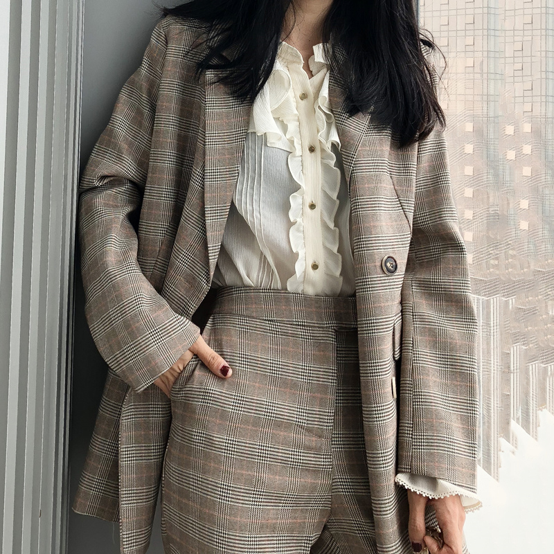 港風格子三件套女秋裝新款寬松西裝外套+高腰百褶半身裙+九分西褲