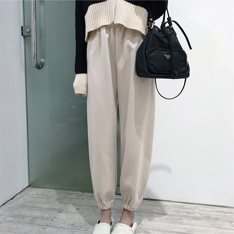 / 秋裝女2018新款拼色長袖針織開衫短外套高腰毛呢哈倫休閑褲子套裝