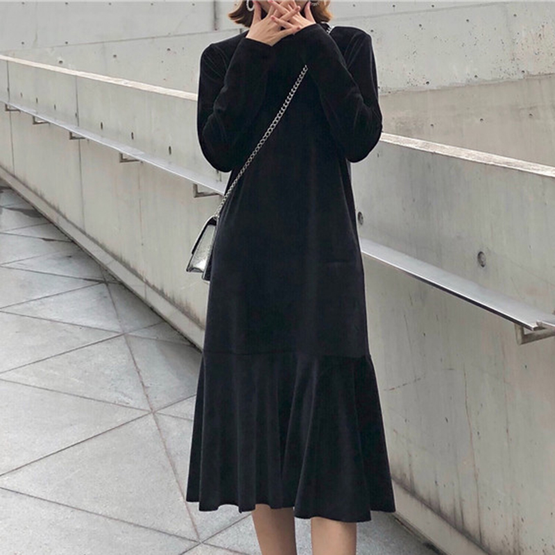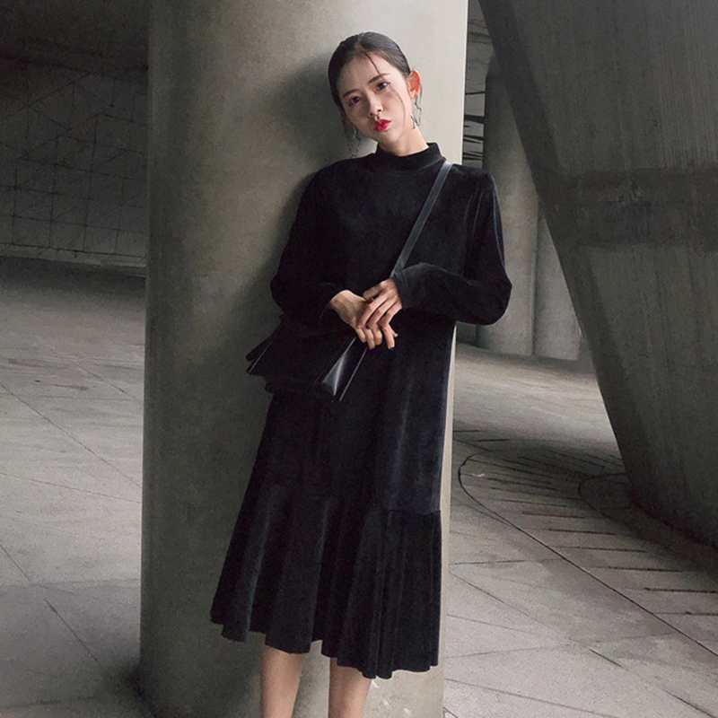 / 氣質絲絨長袖黑裙子秋裝女2018新款時尚半高領中長裙荷葉邊連衣裙
