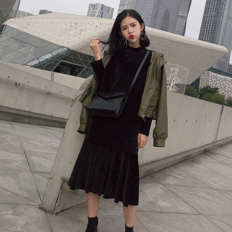 氣質絲絨長袖黑裙子秋裝女2018新款時尚半高領中長裙荷葉邊連衣裙