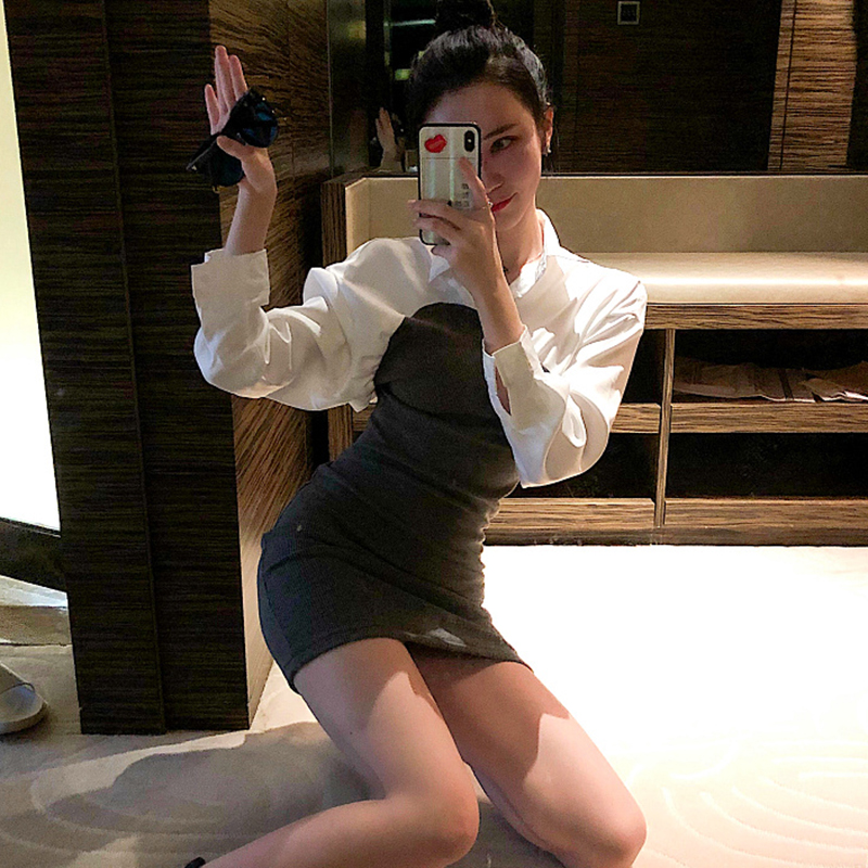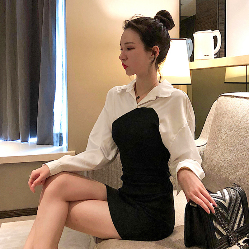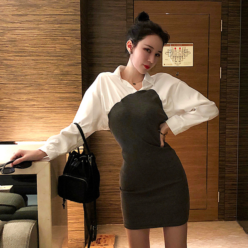 / 拼接假兩件針織裙女秋裝新款修身顯瘦包臀裙子寬松長袖連衣短裙潮
