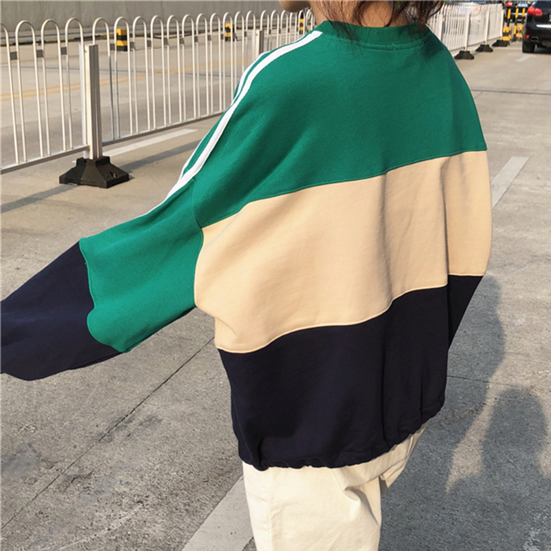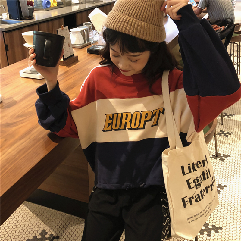 / 慵懶風拼色長袖字母套頭衛衣女秋裝新款學生寬松短款抽繩圓領上衣