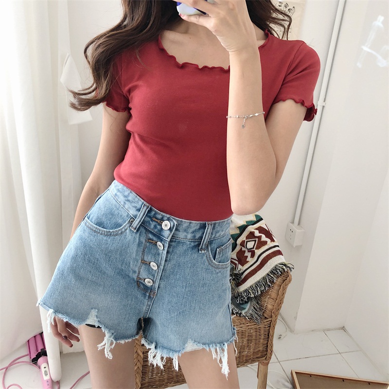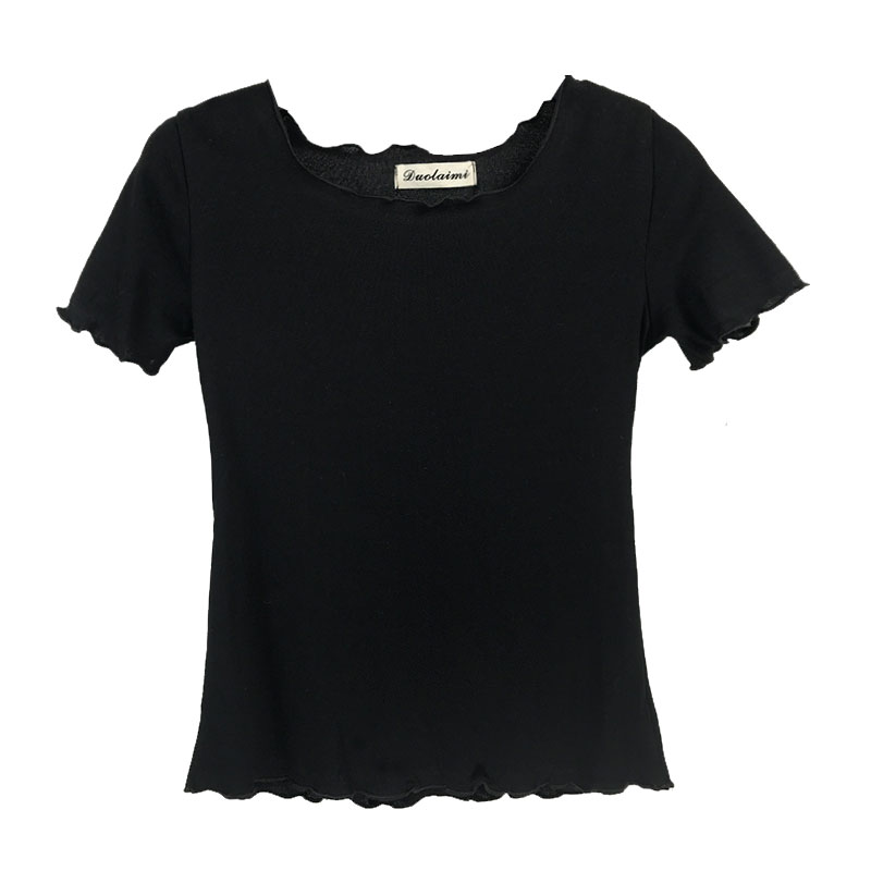 / 春夏新款女裝波浪邊彈力緊身修身顯瘦學生短款百搭短袖T恤上衣女
