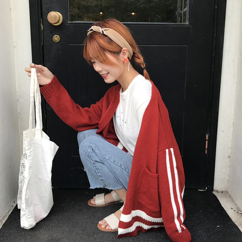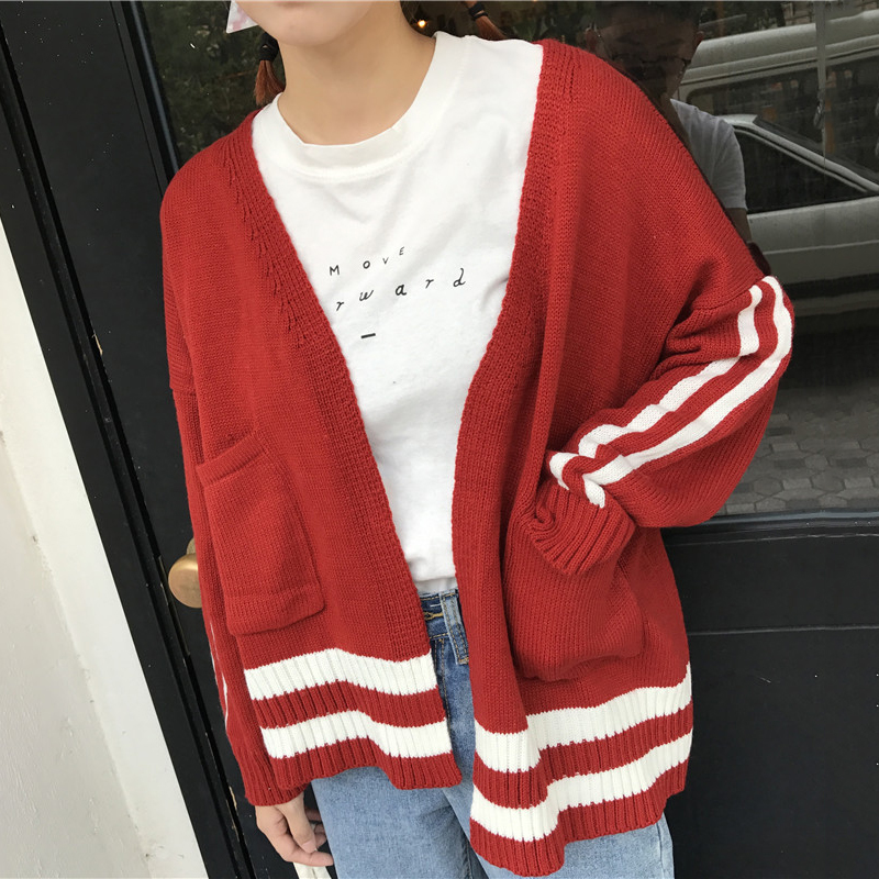 / 時尚撞色條紋針織上衣秋裝韓版寬松慵懶風毛衣女新款休閑開衫外套