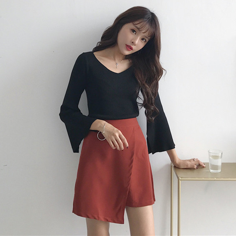 / 秋裝女新款港味復古開叉喇叭長袖針織衫氣質黑色修身打底短款上衣
