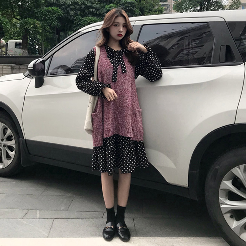 / 秋裝女2018新款寬松長袖波點荷葉連衣裙復古外搭無袖背心毛衣套裝