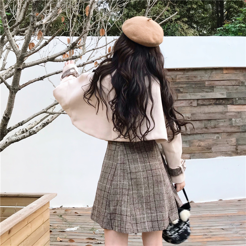 / 韓版時尚休閑套裝秋季短款加厚斗篷毛呢外套+格子吊帶裙兩件套女