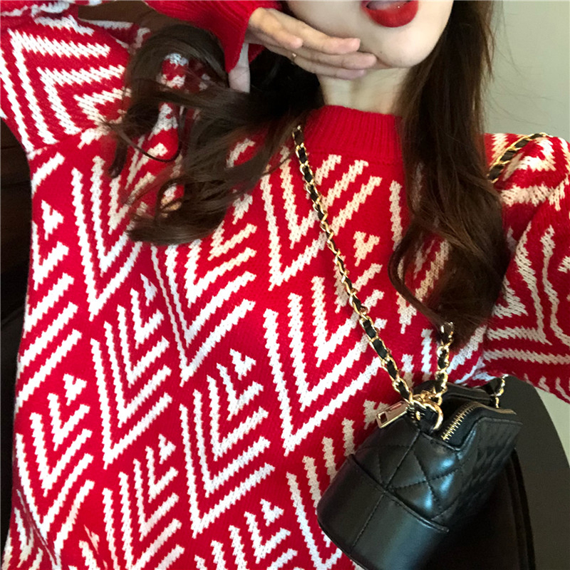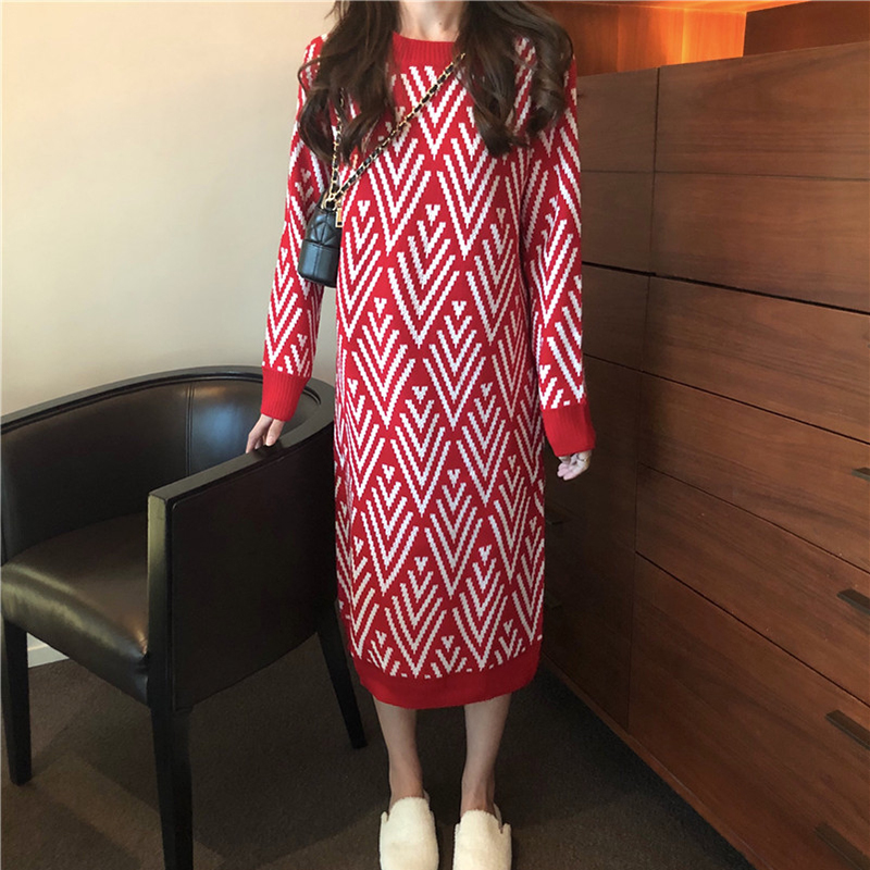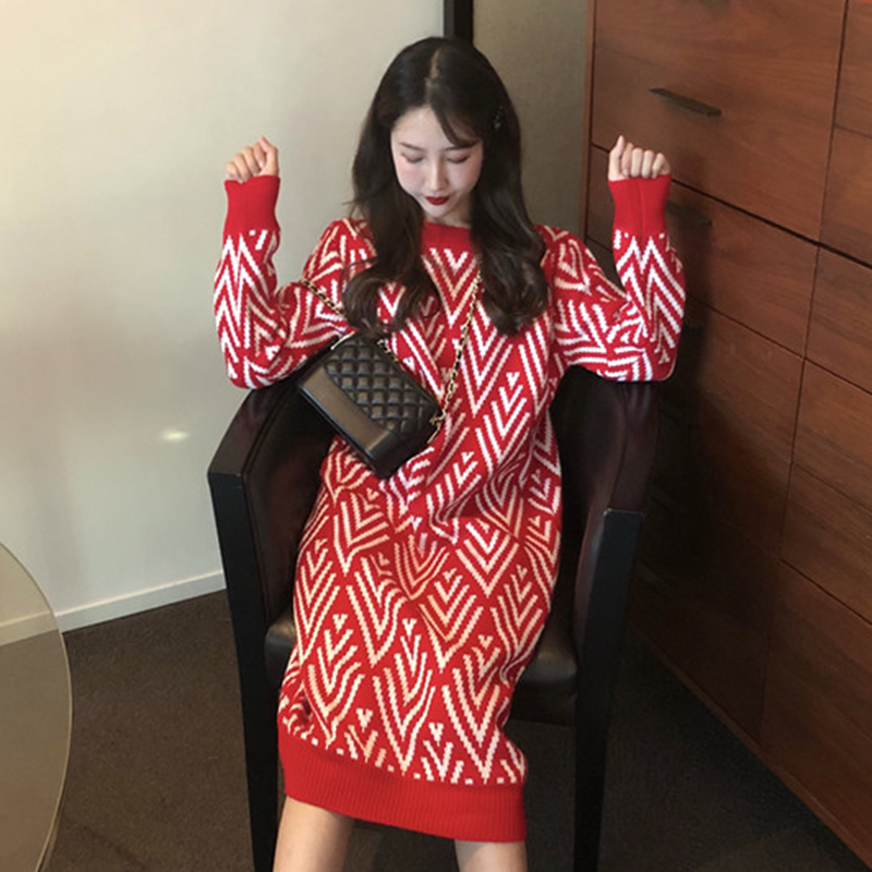 秋裝女2018新款韓版拼色圓領長袖針織連衣裙學生寬松顯瘦中長裙子