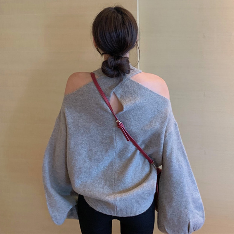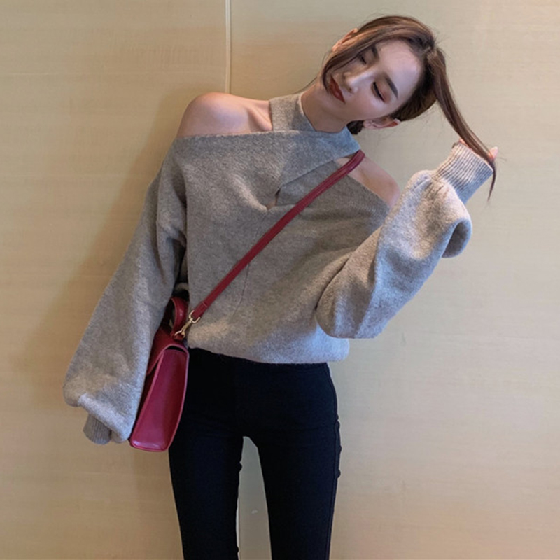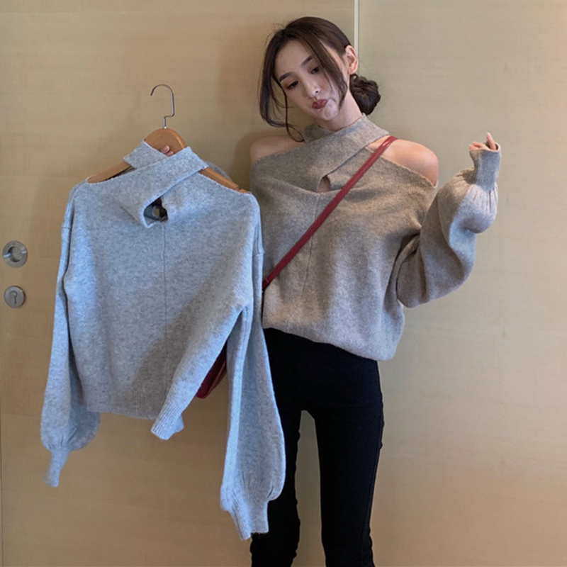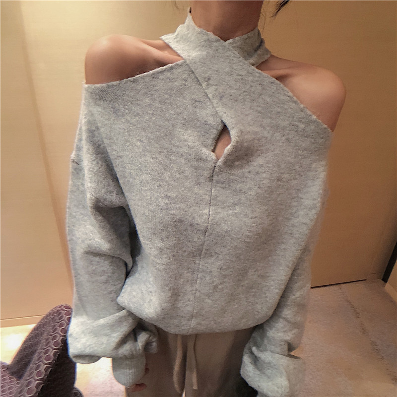 秋冬女裝2018新款寬松長袖針織衫小心機露肩掛脖毛衣學生時尚外套
