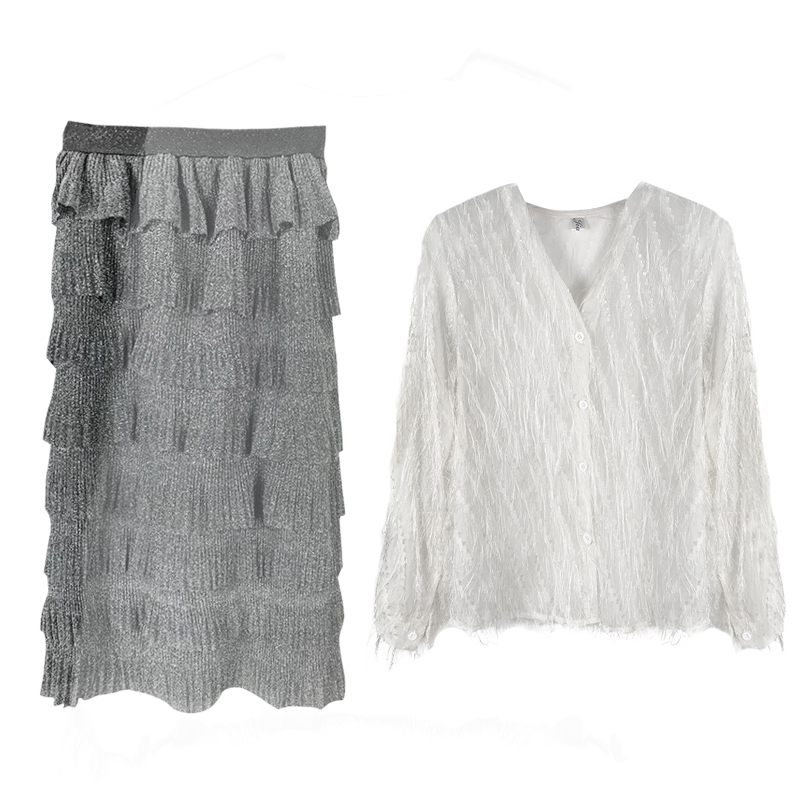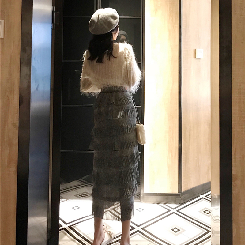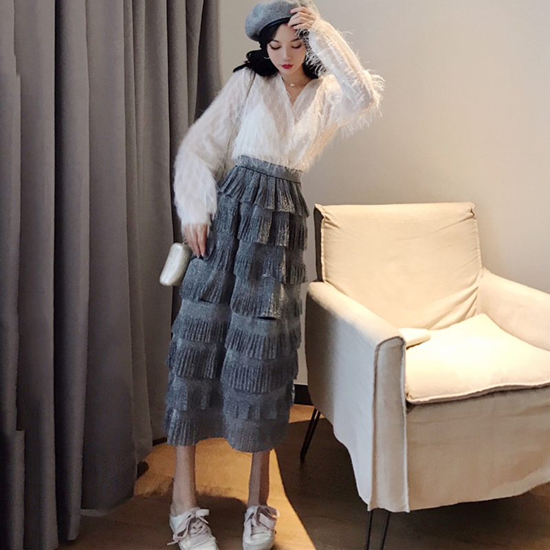 / 韓版時尚套裝女秋新款氣質毛毛長袖上衣+高腰閃閃亮絲蛋糕半身裙