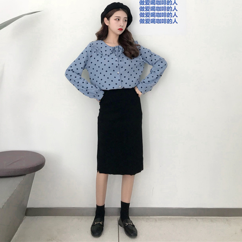 / 女裝2018秋新款小清新波點蝴蝶結長袖上衣少女娃娃領寬松襯衫襯衣