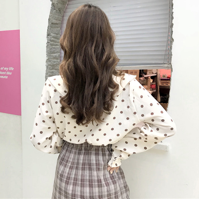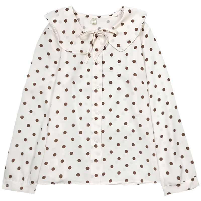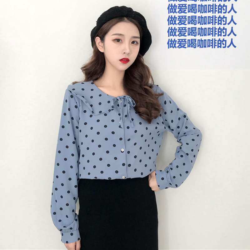 女裝2018秋新款小清新波點蝴蝶結長袖上衣少女娃娃領寬松襯衫襯衣