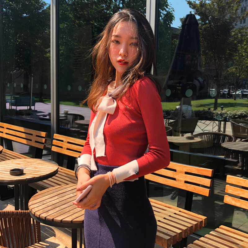 / 毛衣女2018新款秋裝港味復古蝴蝶結上衣氣質修身打底衫長袖針織衫