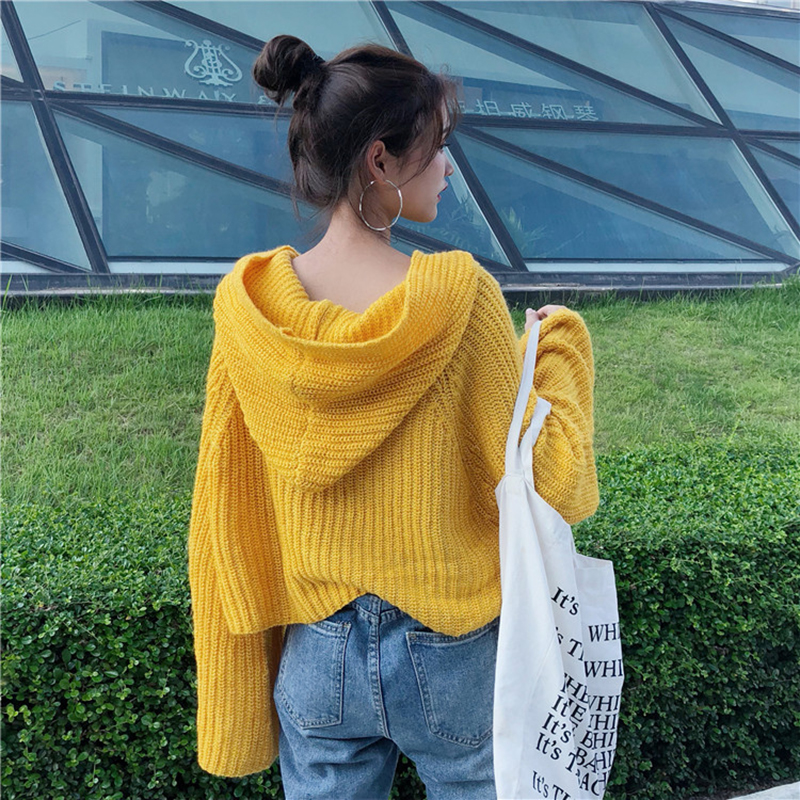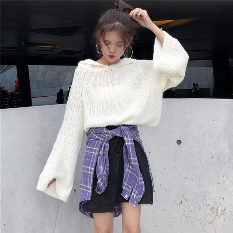/ 連帽套頭針織衫女2018秋裝新款慵懶風蝙蝠長袖毛衣寬松短外套上衣