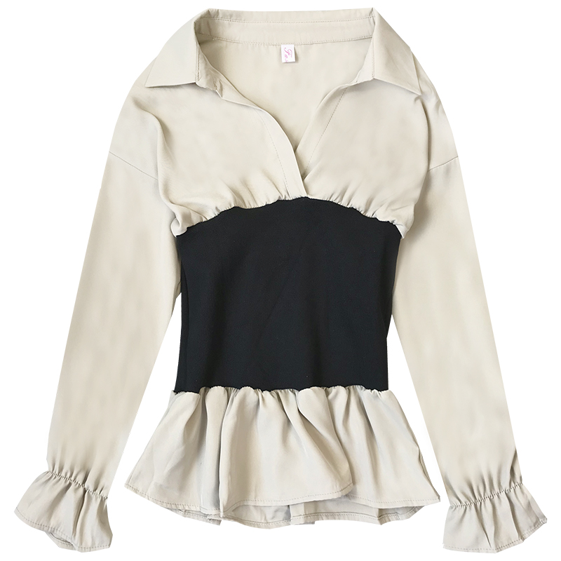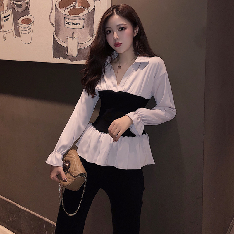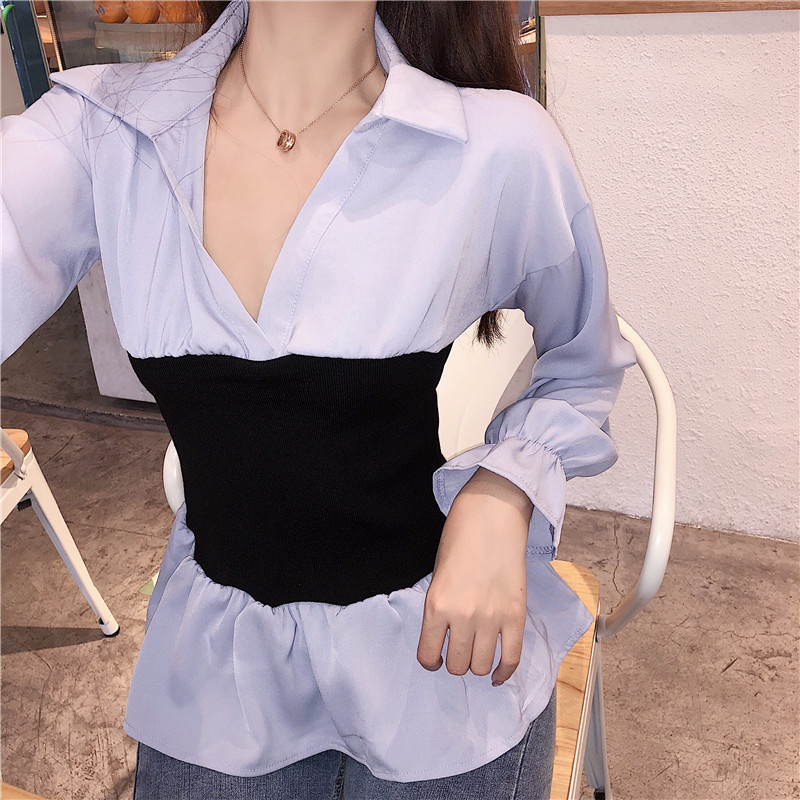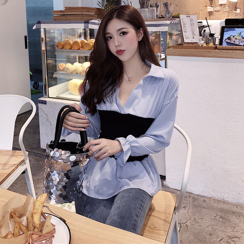 女秋裝2018新款韓版港風氣質收腰長袖襯衫時尚個性抹胸拼接上衣潮