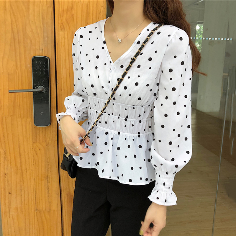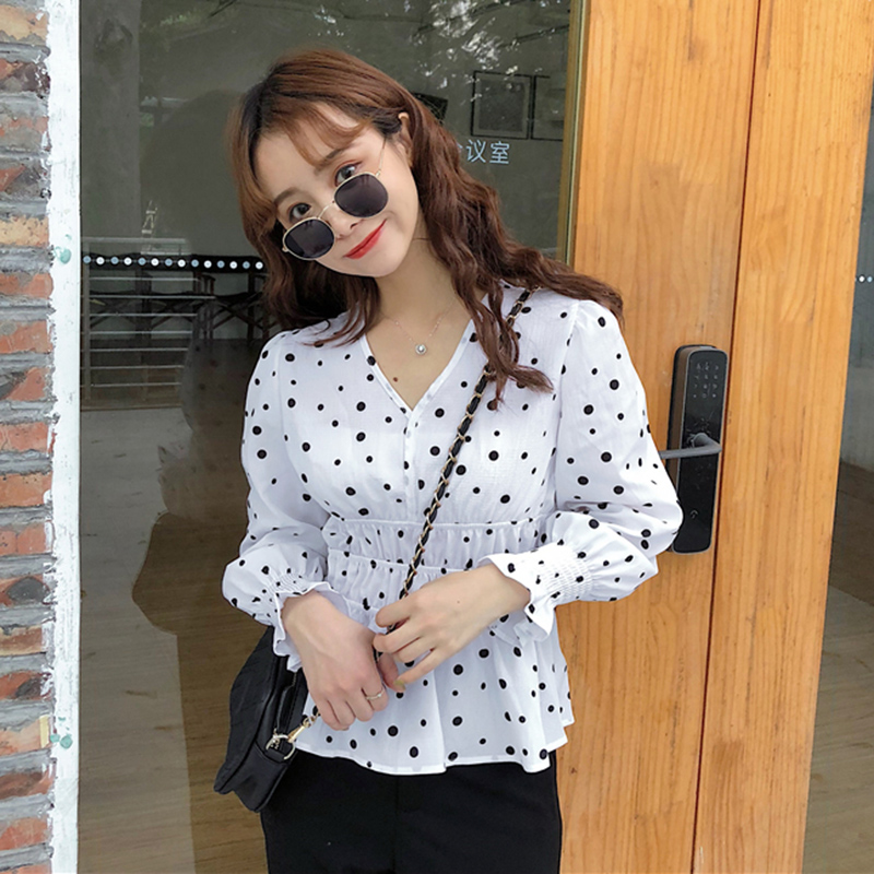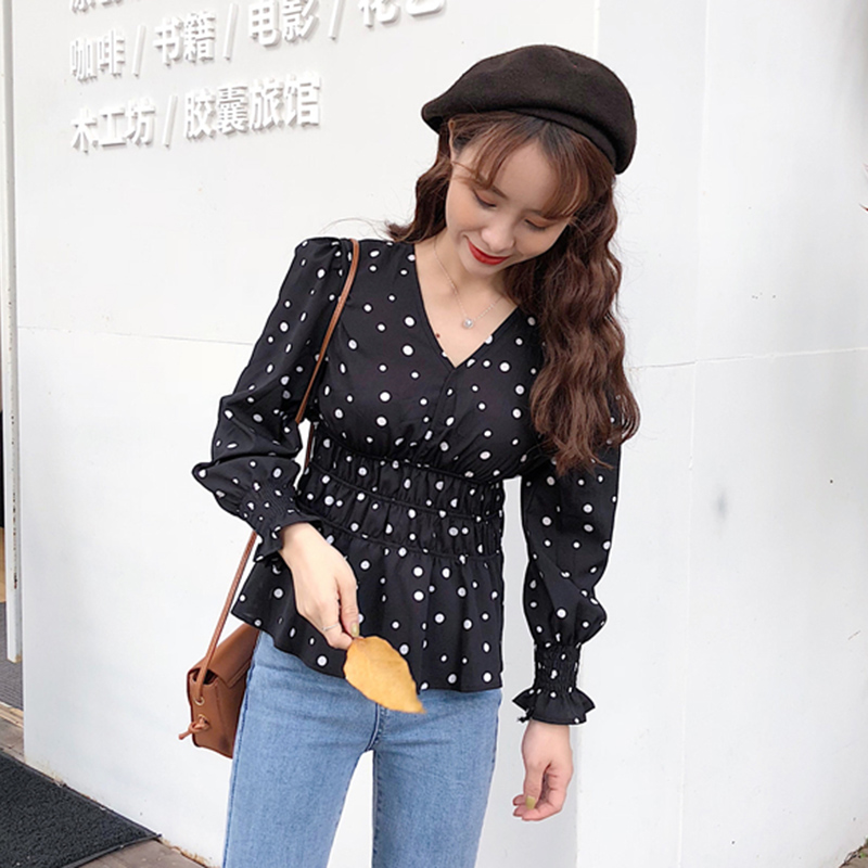 洋氣黑色波點上衣女秋裝2018新款氣質V領長袖荷葉邊娃娃襯衫襯衣