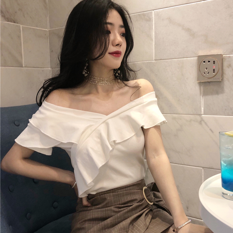 T恤女夏季2018新款韓版一字露肩花邊短款背心荷葉袖修身顯瘦上衣