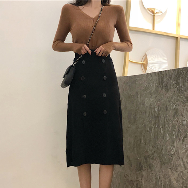 / 港味套裝女秋2018新款修身長袖針織開衫短外套高腰中長半身黑裙子
