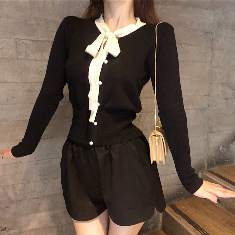 / 秋裝女2018新款學生收腰蝴蝶結開衫長袖短款針織外套高腰黑色上衣
