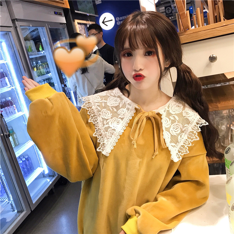 2018新款秋冬女裝韓版寬松學院風蕾絲娃娃領加絨加厚衛衣上衣外套