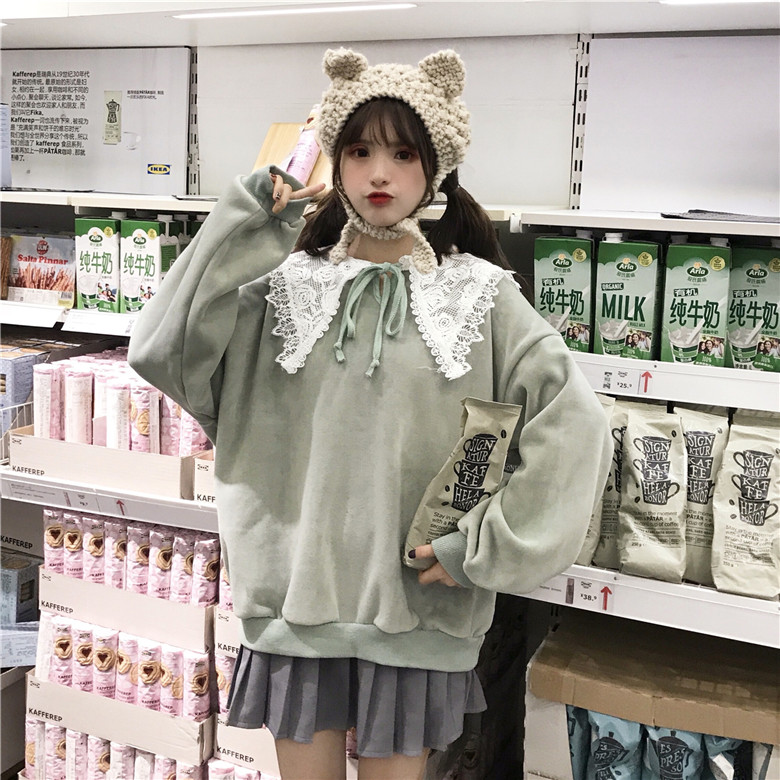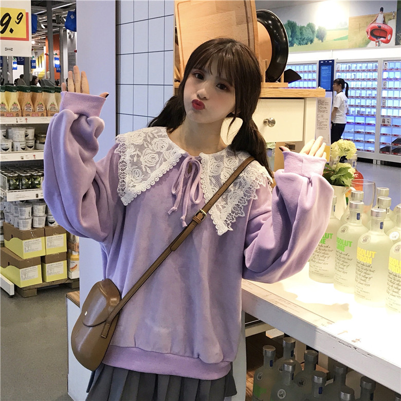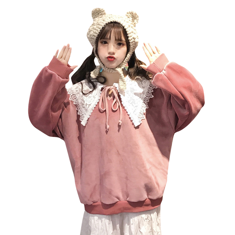 / 2018新款秋冬女裝韓版寬松學院風蕾絲娃娃領加絨加厚衛衣上衣外套