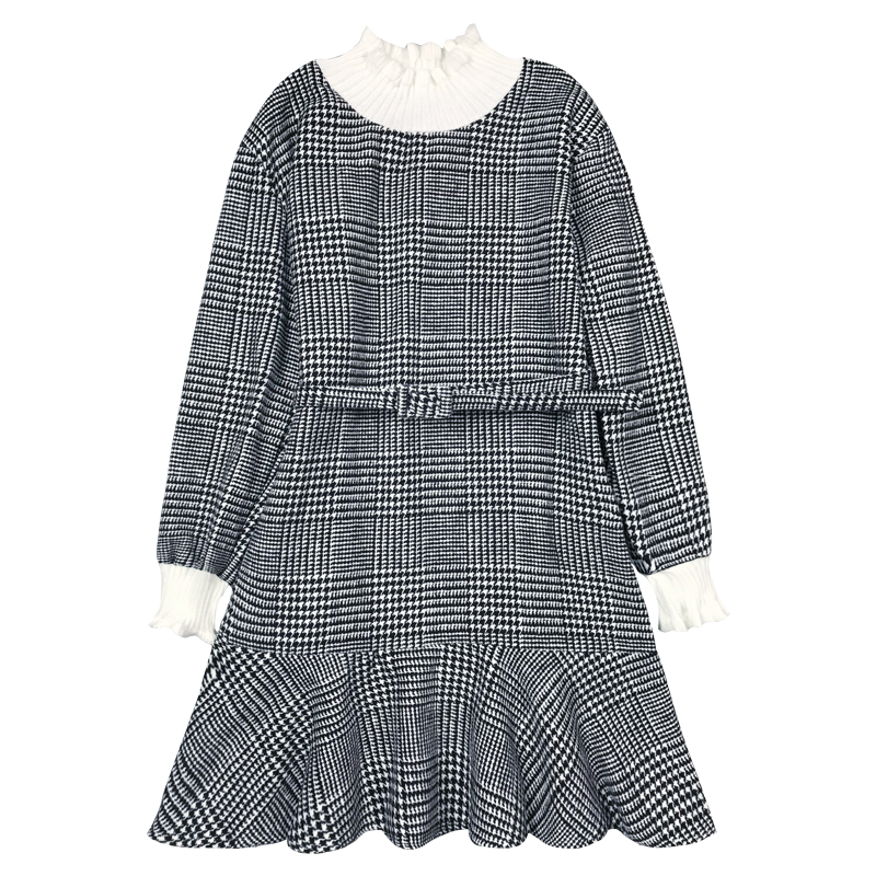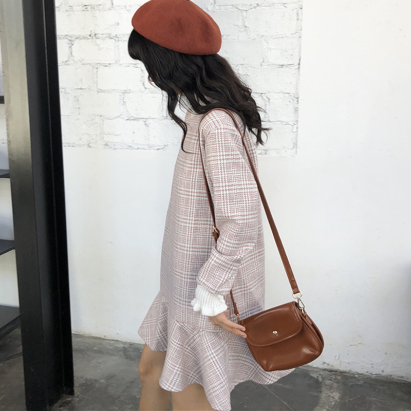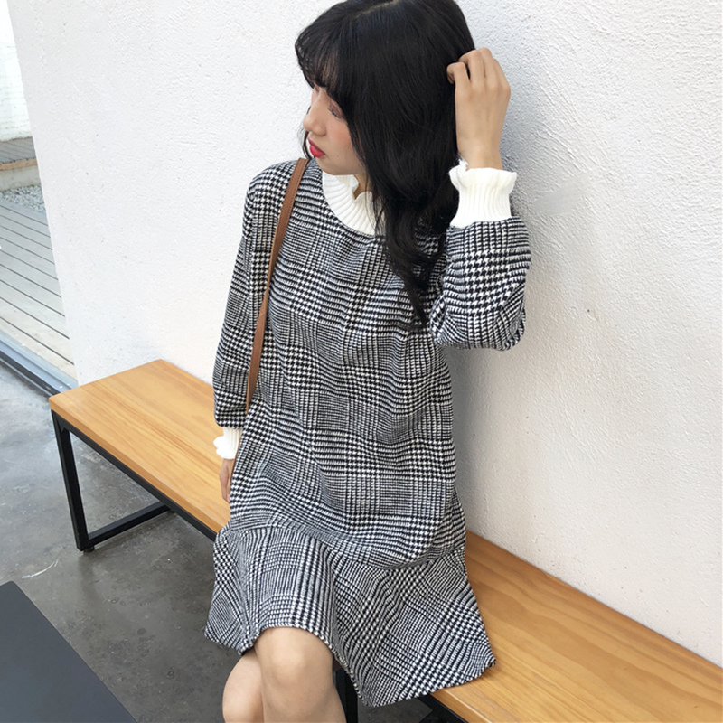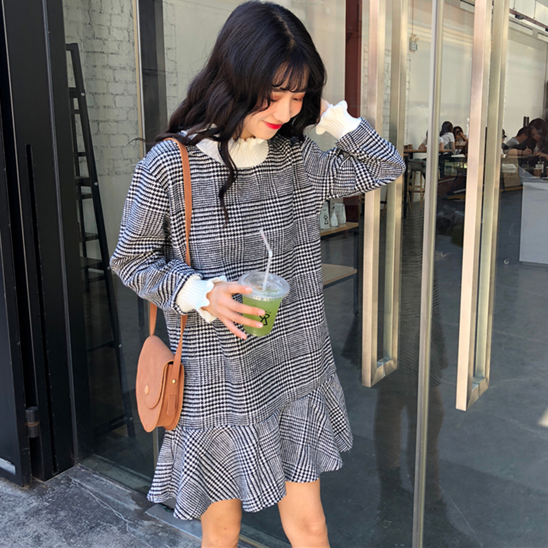 時尚拼色小高領毛呢荷葉邊裙秋裝女2018新款韓版復古格子連衣短裙