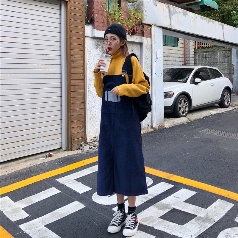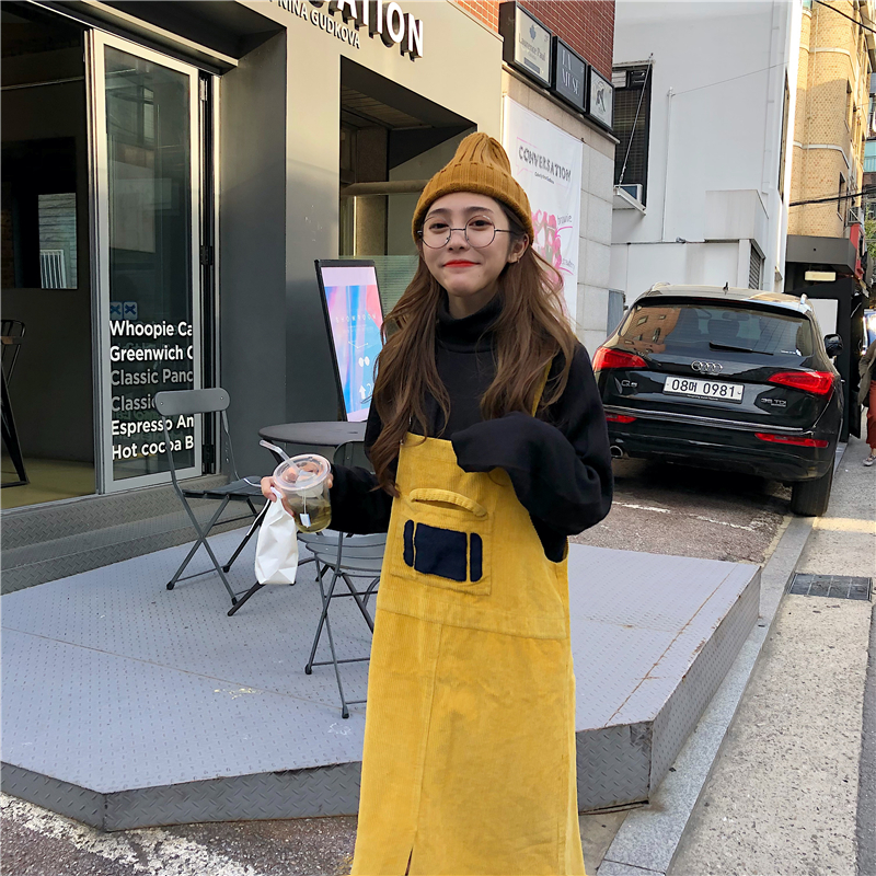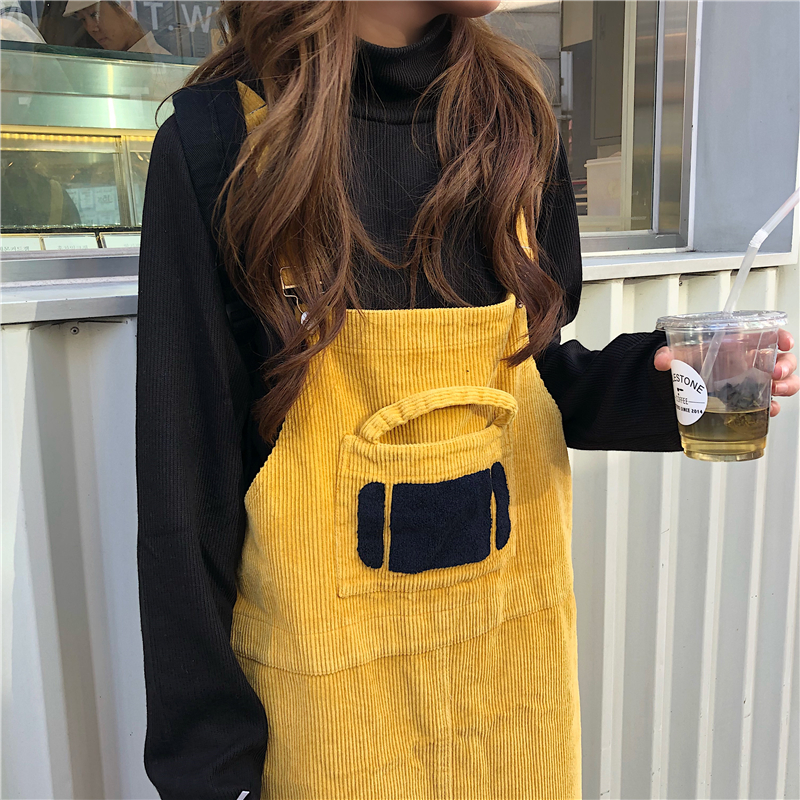 / 秋冬女裝韓版中長款燈芯絨口袋刺繡背帶裙連衣裙長裙+打底針織衫