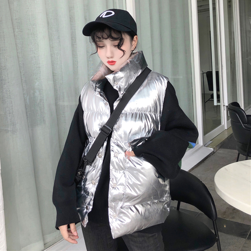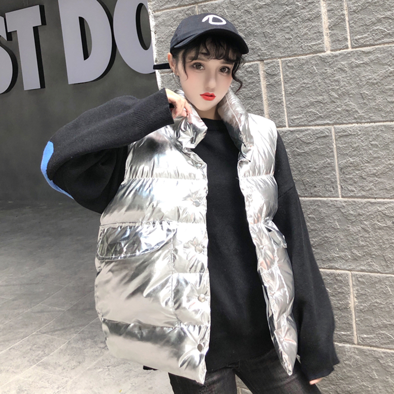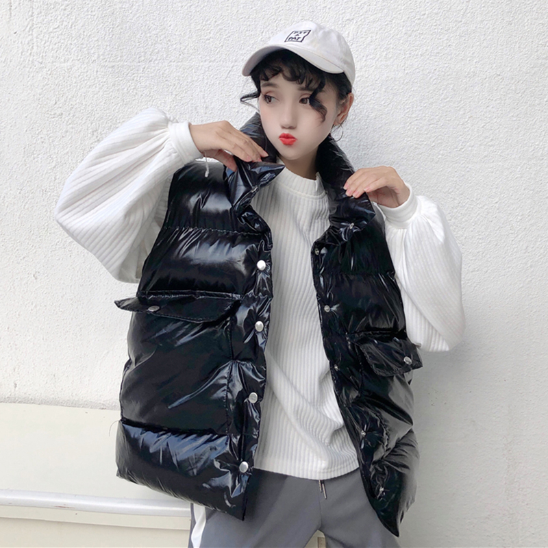 原宿中長款立領馬甲秋裝女2018新款韓版學生寬松黑色外套亮面棉襖