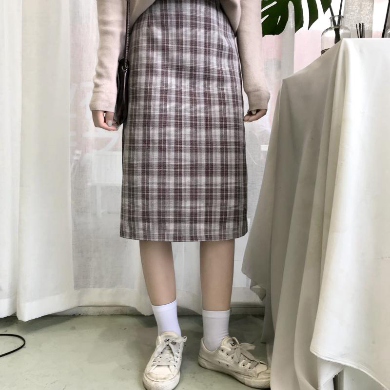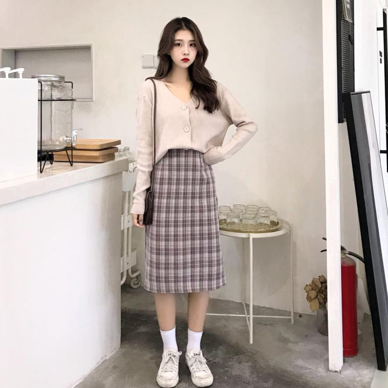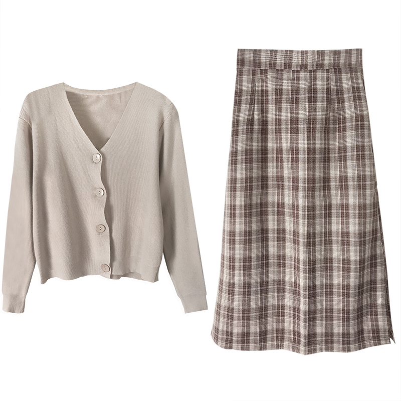 / 女秋季新款韓版長袖針織開衫外套上衣+高腰格子a字半身裙時尚套裝