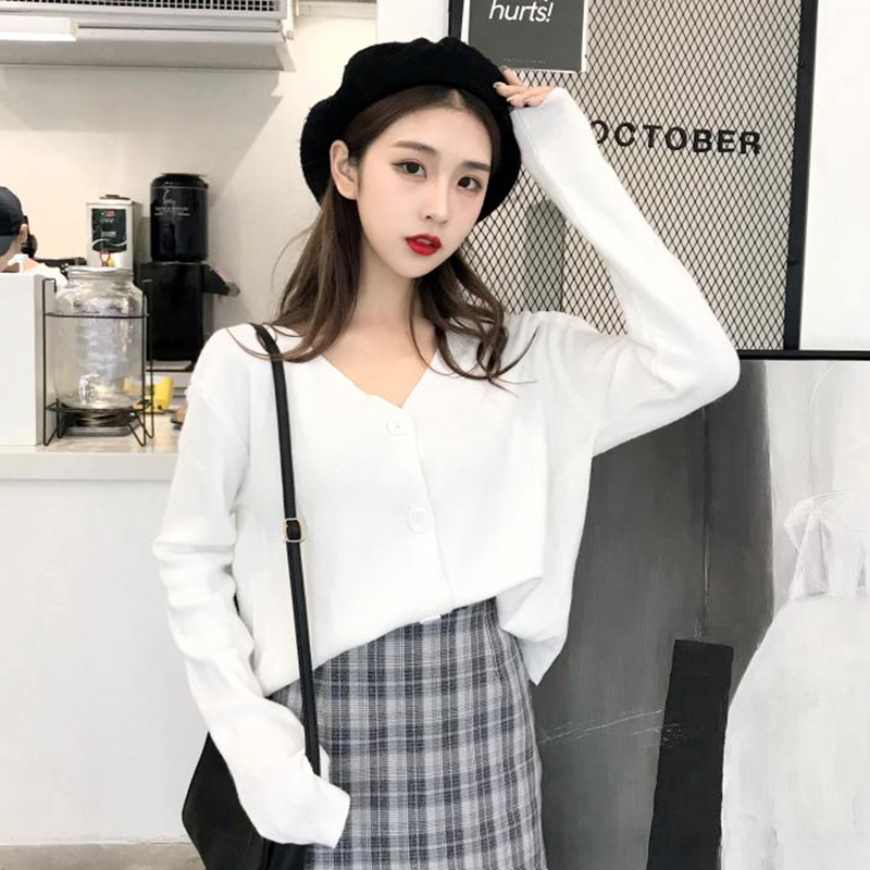 女秋季新款韓版長袖針織開衫外套上衣+高腰格子a字半身裙時尚套裝