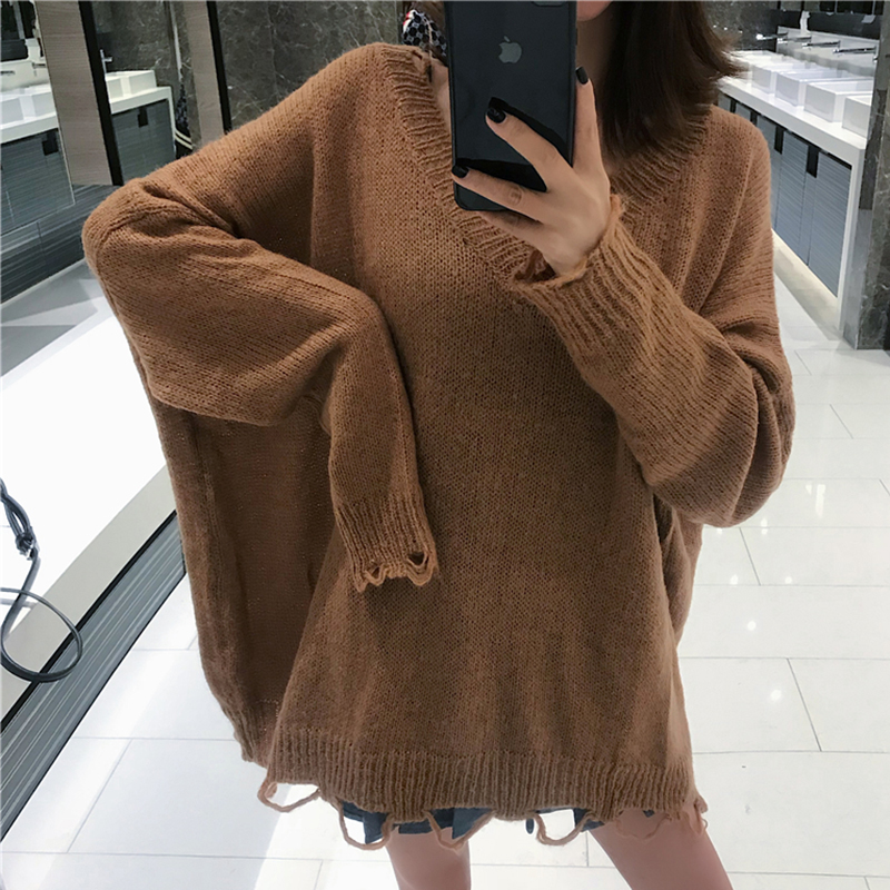 秋裝針織上衣女2018新款慵懶毛衣復古寬松時尚破洞V領長袖打底衫