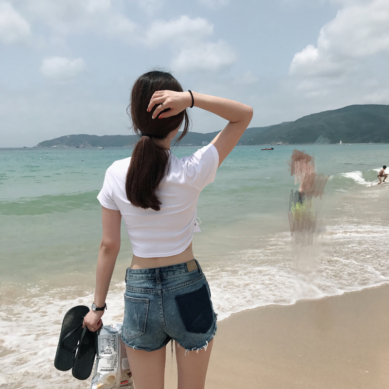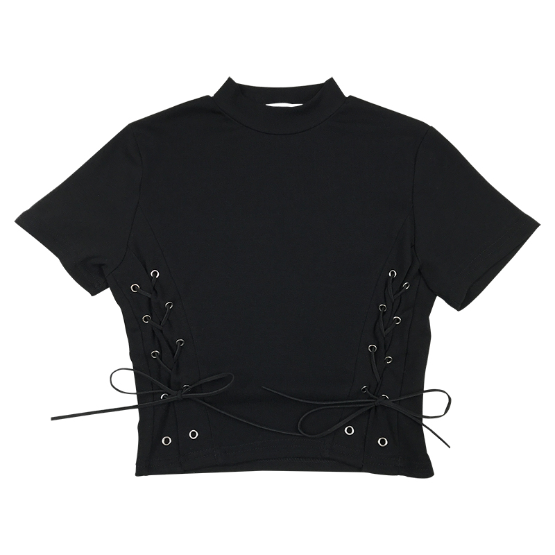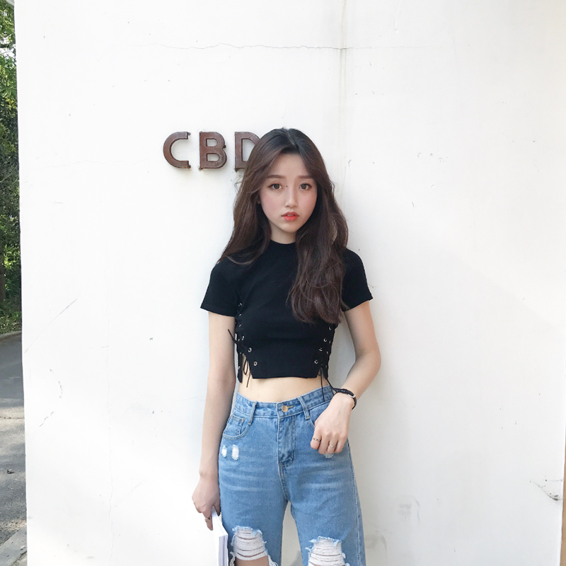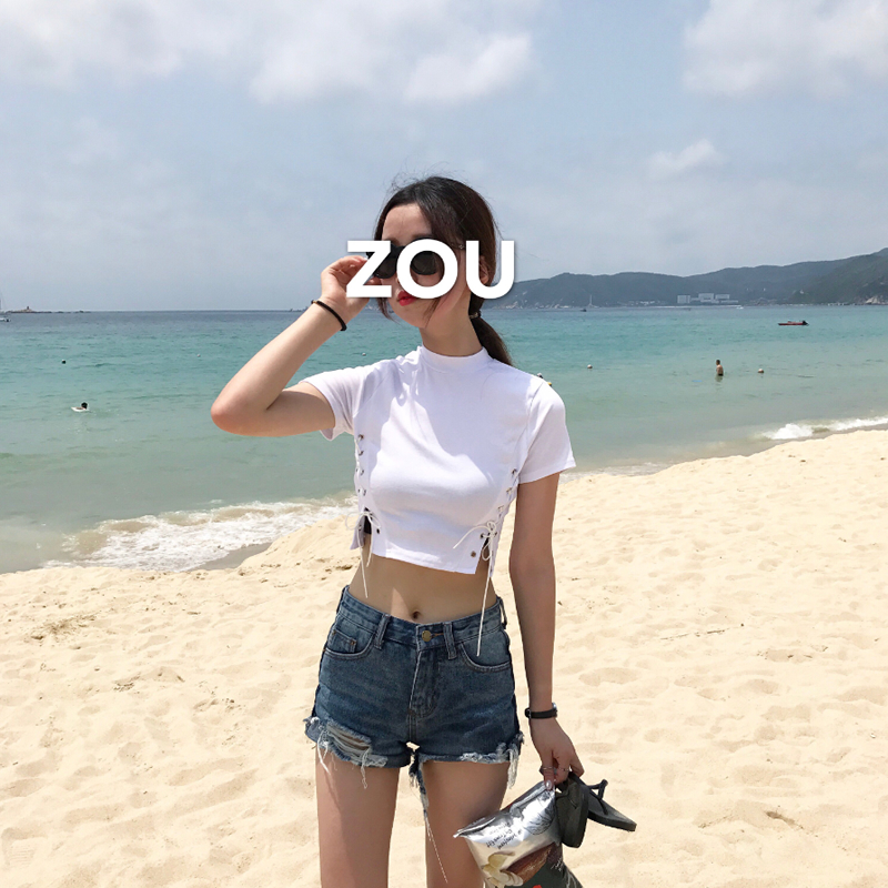 / 秋裝女2018新款短款黑色t恤女露臍短袖女露臍裝短袖綁帶系帶上衣