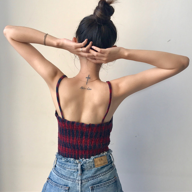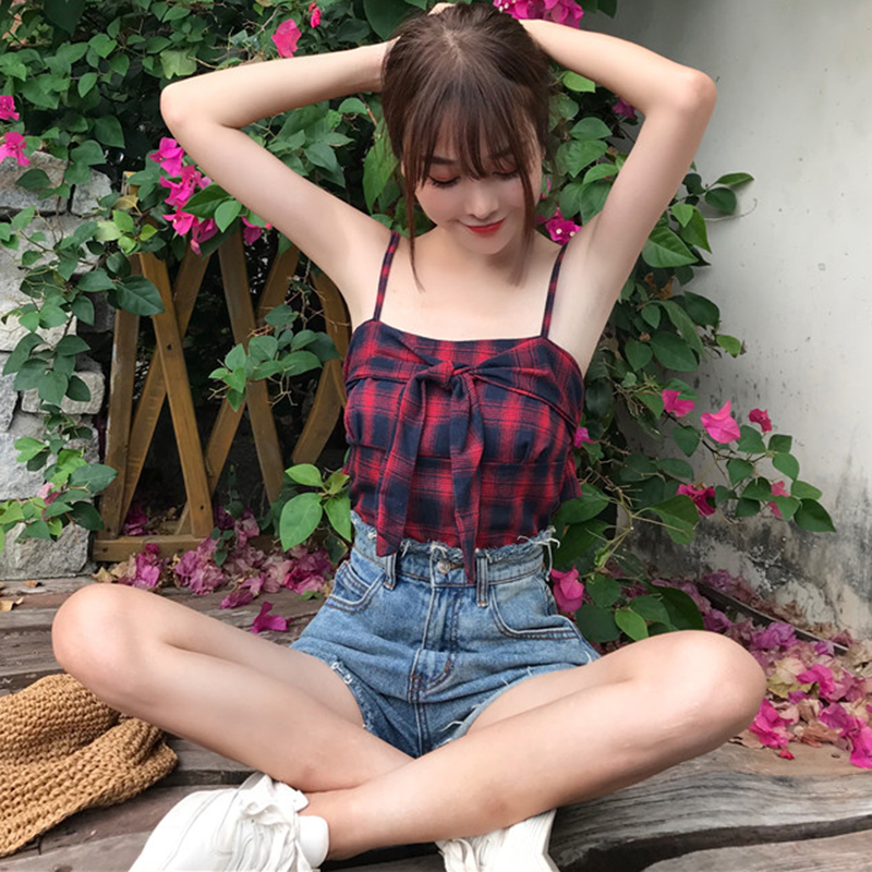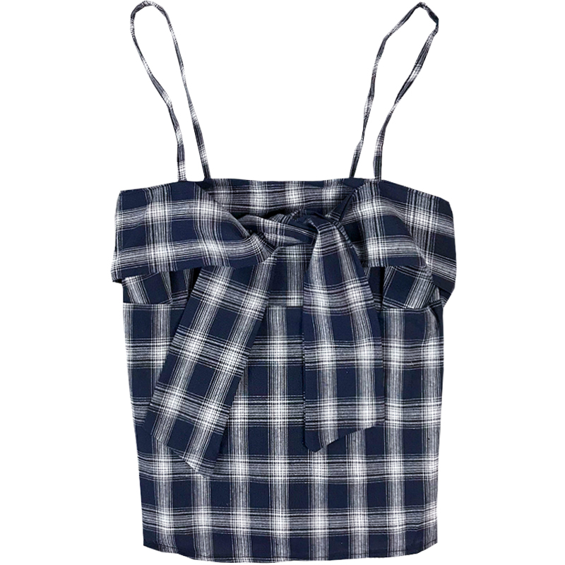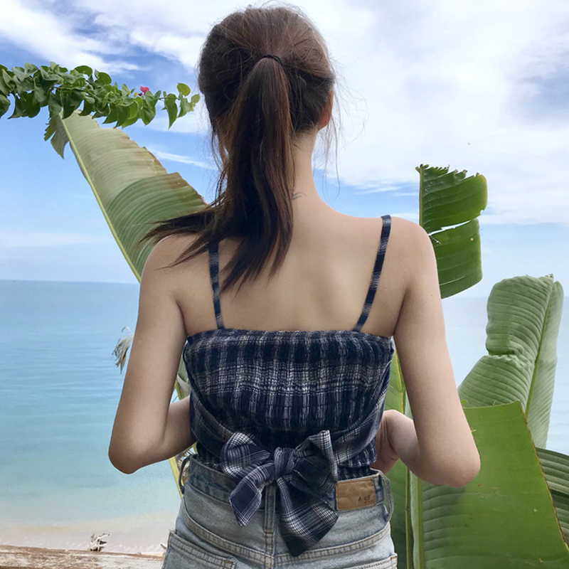 / 夏季女裝新款韓版蝴蝶結綁帶抹胸上衣小清新短款格子吊帶露肩背心