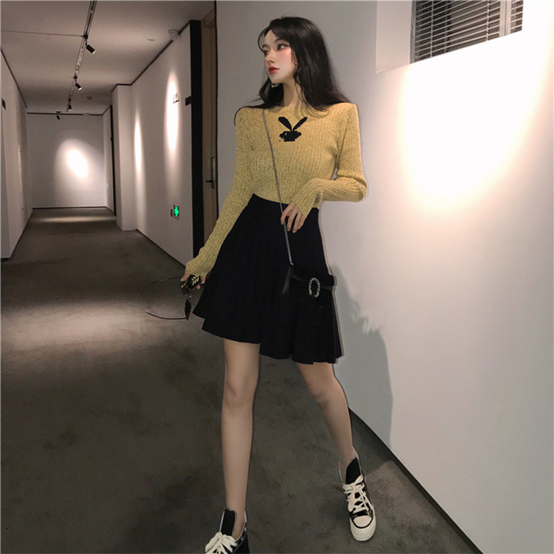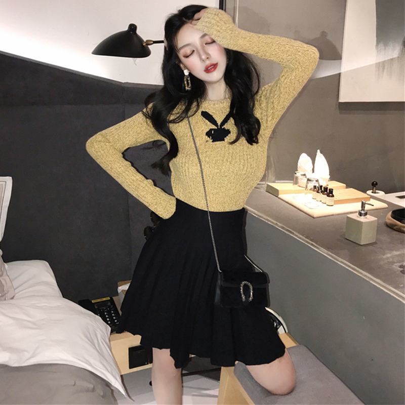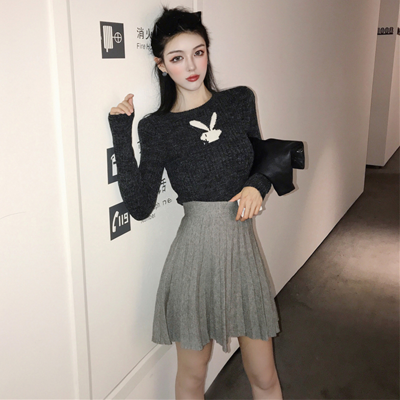 洋氣套裝女秋冬2018新款修身長袖打底毛衣高腰顯瘦百褶針織半身裙