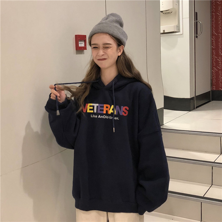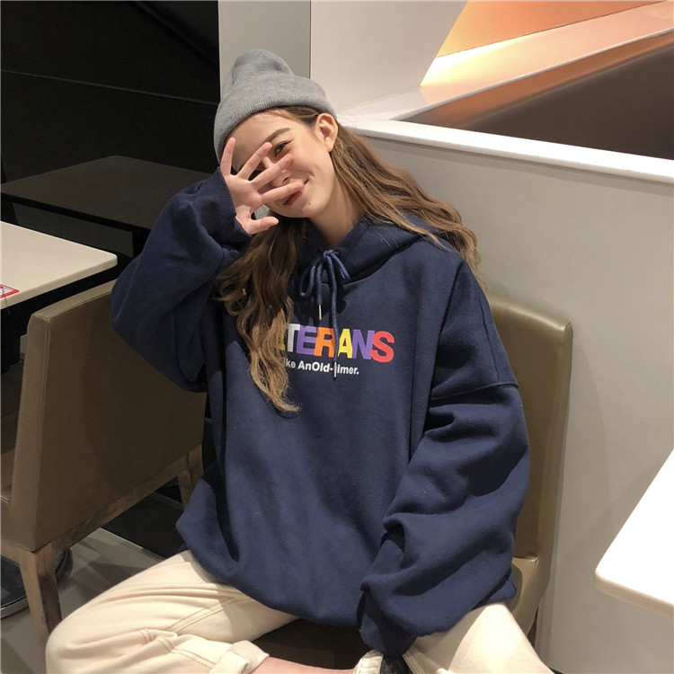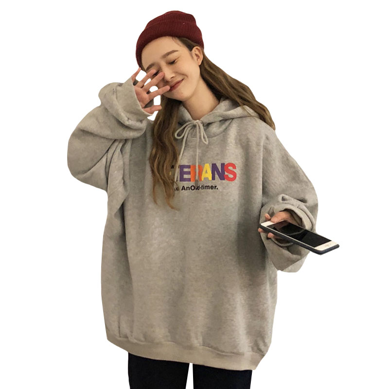 / 秋冬女裝韓版中長款原宿風彩色字母寬松加絨加厚連帽衛衣上衣外套