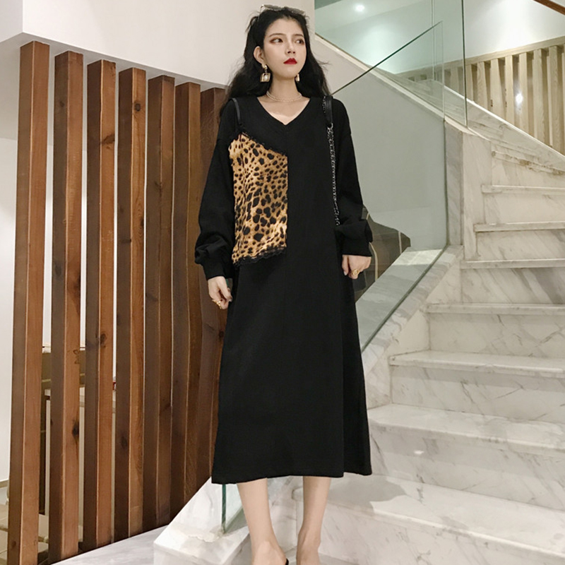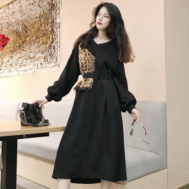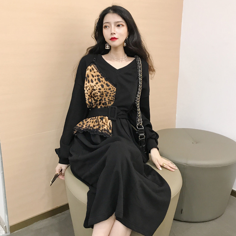 秋裝女2018新款時尚豹紋拼接V領長袖連衣裙氣質收腰顯瘦中長裙子