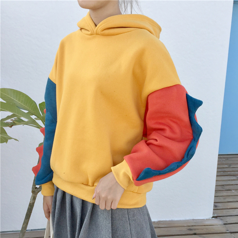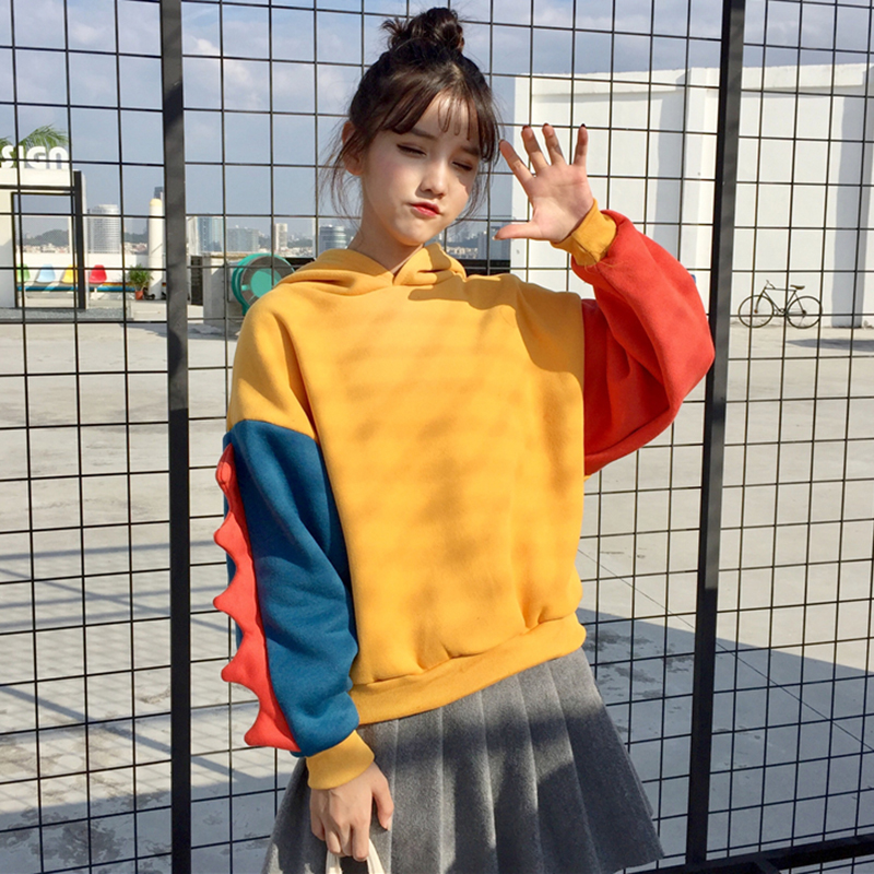 / 秋冬女裝韓版學院風個性撞色拼接可愛小恐龍寬松加絨連帽衛衣外套