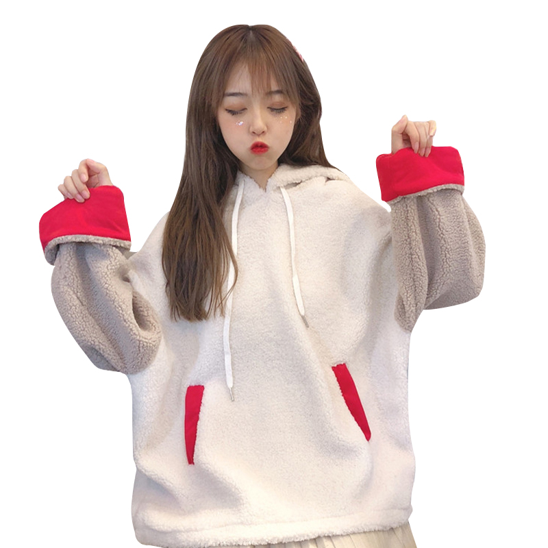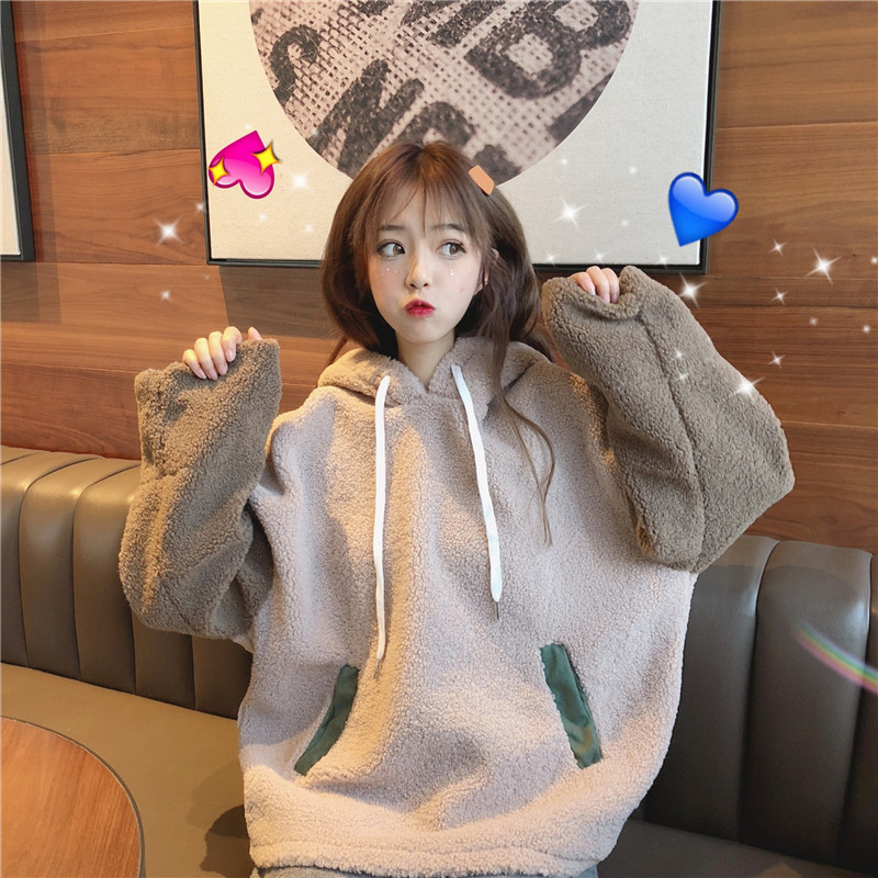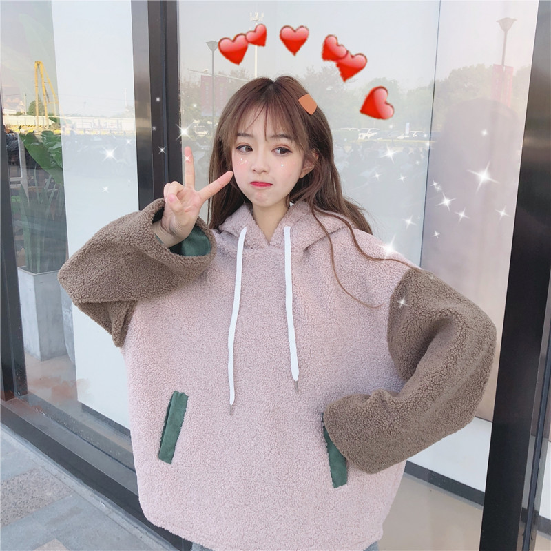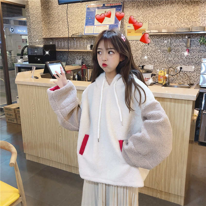 / 秋冬女裝韓版復古寬松撞色拼接仿羊羔毛連帽加厚套頭衛衣上衣外套